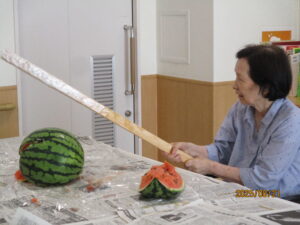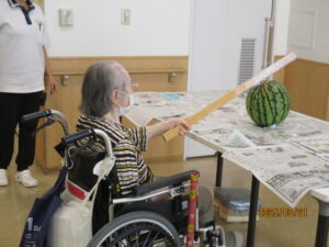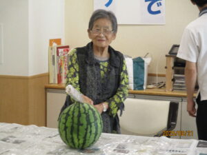 また、もう一つのメインイベント、スイカ割りも大盛り上がりでした。棒を握った皆様が力いっぱいにスイカを叩くと、フロアからは自然と「もっと右!」「そのまままっすぐ!」と応援の声が上がります。見事にスイカが割れると、皆様の協力で成し遂げた達成感から大きな拍手が沸き起こりました。