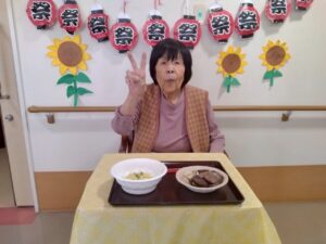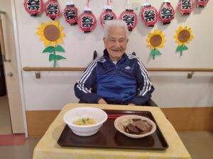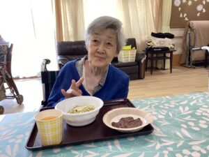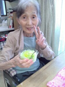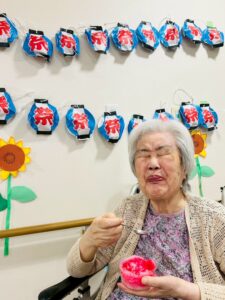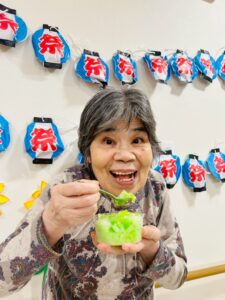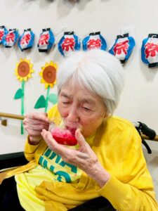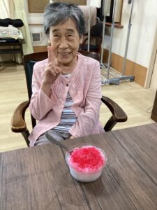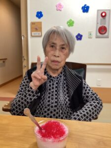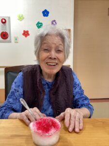 お肉でお腹がいっぱいになった後は、冷たいかき氷を召し上がっていただきました。イチゴ、メロン、レモンなど、色とりどりのシロップの中から好きなものを選んでいただくと、「どれにしようかな」と皆様の顔がぱっと明るくなります。ひんやり甘いかき氷に、「冷たくておいしいね」と、笑顔があふれていました。
